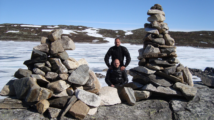 Auch wenn das nur Niveau der deutschen Mittelgebirge hat, erschlägt uns die Landschaft mit ihrer rauhen Schönheit. Vorbei an schneebedeckten schroffen Steinhaufen und Gletscherseen geht es bis zm Hotel Halne Fjellstova, wo wir Kaffee und Schokomilch trinken.
