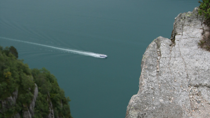 Die Route durch die Steine ist mit roten Markierungen gekennzeichnet, weitere Hilfsmittel gibt es nicht - bis auf einen kleinen Teil kurz vor dem Ende des Aufstiegs. Dort sind dann doch ein paar Treppen gebaut worden und wir finden für ca. 50m Halt an einem Geländer. Danach haben wir es dann fast geschafft - auch wenn sich die 'Halleschen Wiesel' von den 'Münchner Faultieren' mittlerweile deutlich abgesetzt haben. Eine letzte Biegung, ein kleiner Anstieg und dann: WOW! Was Mutter Natur hier veranstaltet hat ist einfach nur beeindruckend. Bilderbuch-Landschaft ist untertrieben. Vom Vorplateau aus genießen wir den Blick auf den Preikestolen (Predigtstuhl) und begreifen, woher der Name kommt! 604 Meter tiefer schillert der Fjord in blautürkis. Die Touristenschiffe dort unten sehen aus wie Ruderboote.